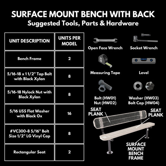 Surface mounts are designed to anchor benches directly onto existing hard surfaces like concrete pads or paved areas. This option is ideal for locations where digging is not feasible or desired, such as urban parks, sidewalks, or courtyards. The primary benefit is ease of installation and relocation. Surface mounts offer stability without requiring excavation, and they’re a great choice when you need a clean, polished look on hard surfaces.