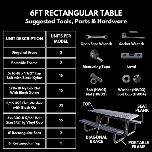 Step #6 — Level tops and seats and use socket and open face wrench to fully tighten hardware. Place bolt end caps on bolt ends.